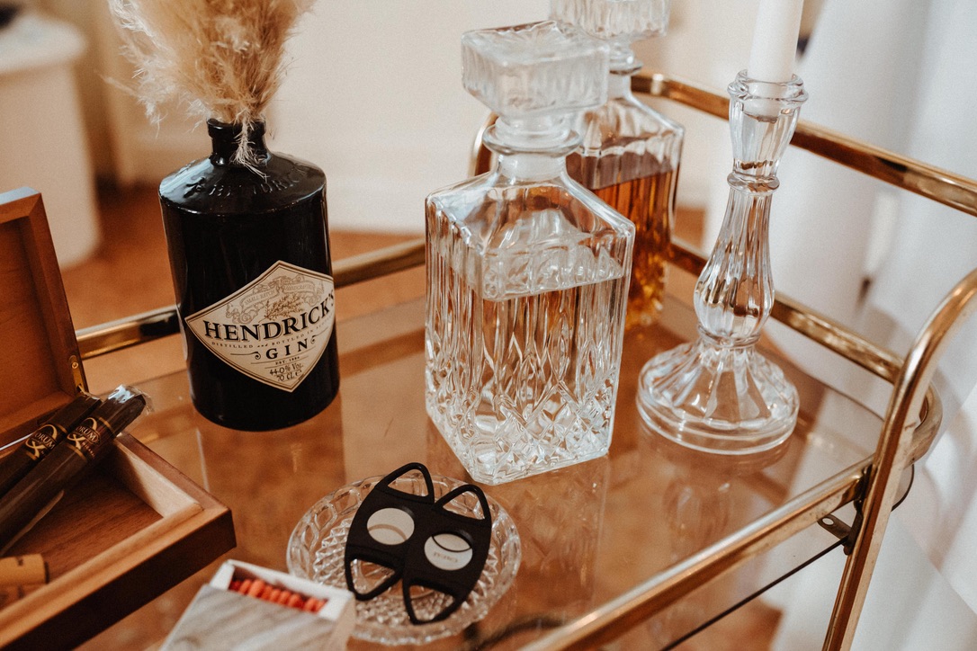 Gentlemencorner Set (1x Servierwagen Gold, 2x Karaffen, 6x Whisky Gläser, 6x Shotgläser, Zigarrenbox