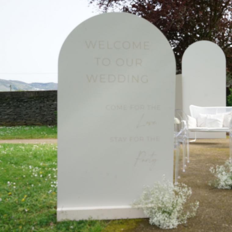 Welcome Sign in halbrunder Form weiß "Come for the love, Stay for the Party" - 160 x 100cm
